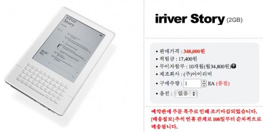 iriver’s Story ebook reader has gone up for preorder, priced at the equivalent of around $281. Set to begin shipping on October 6th, the Story has a 6-inch E-Ink display, QWERTY keyboard and an SD card slot; iriver supply a 2GB card with the device, along with a case and two free ebook downloads.